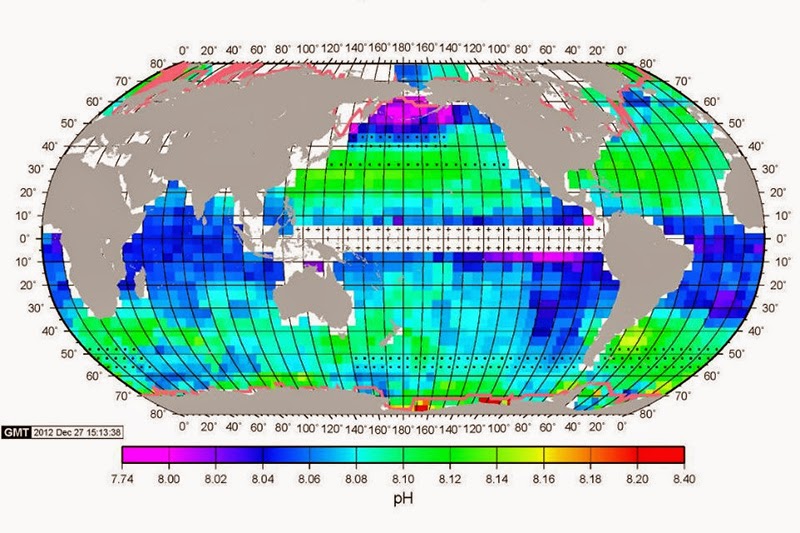 La carte mondiale de l’acidification des océans (unité pH) est mise à jour mensuellement et rend compte des augmentations et diminution du pH en fonction de la saison et de la géographie. Plus le pH est faible, plus l’acidité est forte.